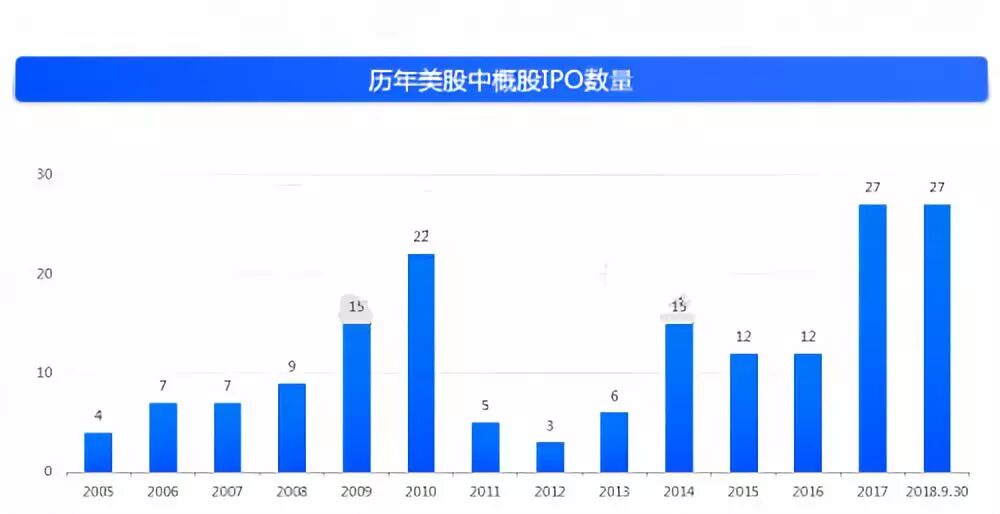 富途证券整理了2005以来中概股赴美IPO发行数量。截止今年9月30日,今年于美股IPO的中概股已达27家,已追平去年所创的历史最高记录。从融资额看,27家新上市公司累计IPO募集资金约69.5亿元,是2017年全年美股中概股IPO募集额34亿元的2倍多。