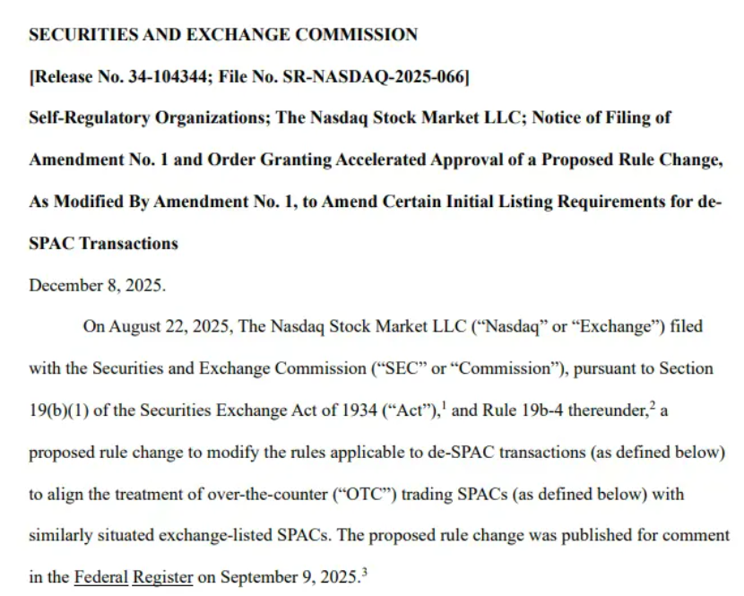 2025年12月8日,美国证券交易委员会(SEC)以高效之姿,正式通过了纳斯达克证券交易所提交的一项上市规则修订提案。这一新规的落地,犹如一颗重磅炸弹,在资本市场激起千层浪,为特定类型的特殊目的收购公司(SPAC)带来了前所未有的转板机遇。