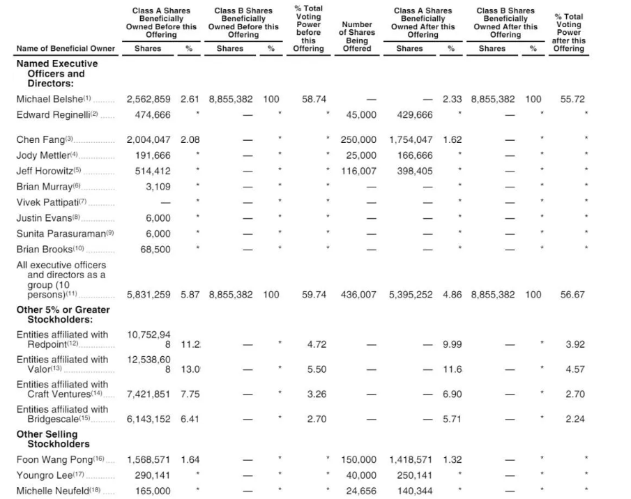 IPO前,Michael Belshe持有2.61%的A类股,100%的B类股,有58.74%的投票权;